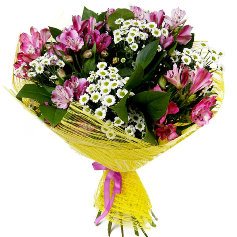Букет состоит из 7 альстромерий, 4 ветки ромашковой хризантемы, салал, красивая упаковка, атласная лента.