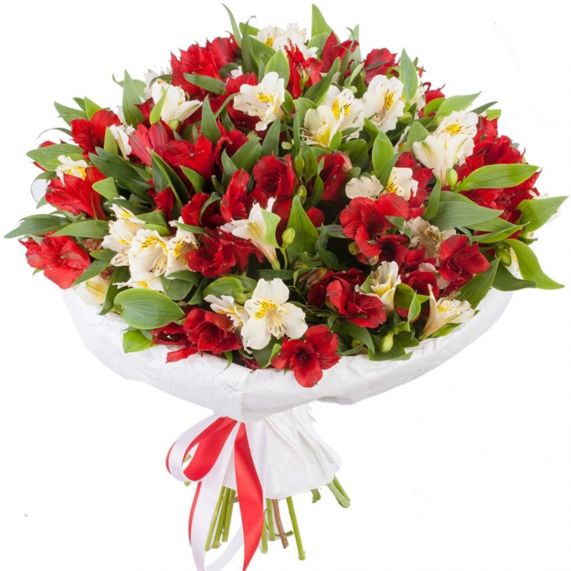 Букет состоит из 19 веток красных и белых альстромерий, зелень, красивая упаковка, атласная лента.