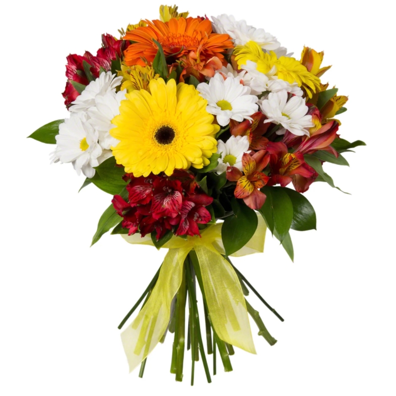 Букет состоит из 3 герберы, 3 хризантемы, 7 альстромерий, зелень, прозрачная упаковка, атласная лента.