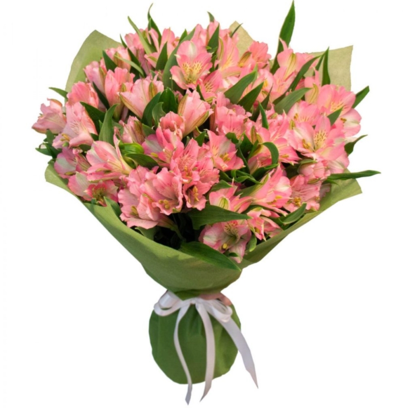 Букет состоит из 15 веток розовых альстромерий, зелень, красивая упаковка, атласная лента.
