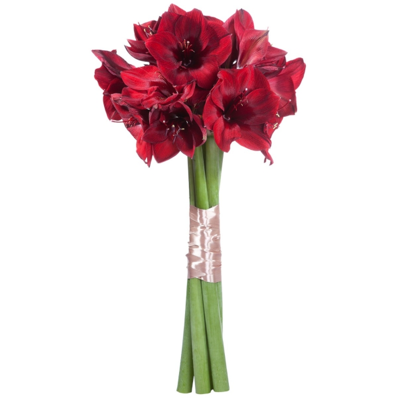 Букет состоит из 5 красных амариллисов, прозрачная упаковка, атласная лента.