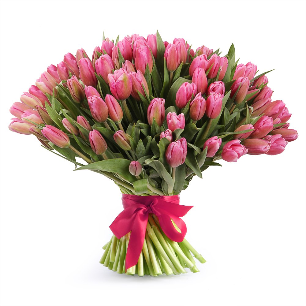 Букет состоит из 101 розовый тюльпан, прозрачная упаковка, розовая лента.