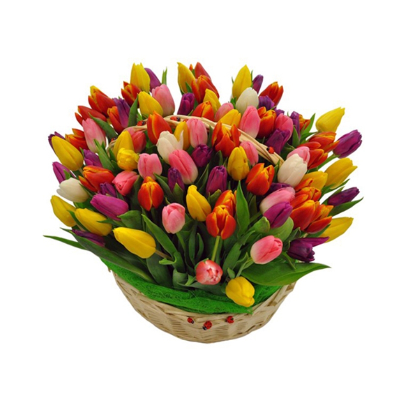 Букет состоит из MIX из 101 тюльпана, корзина.