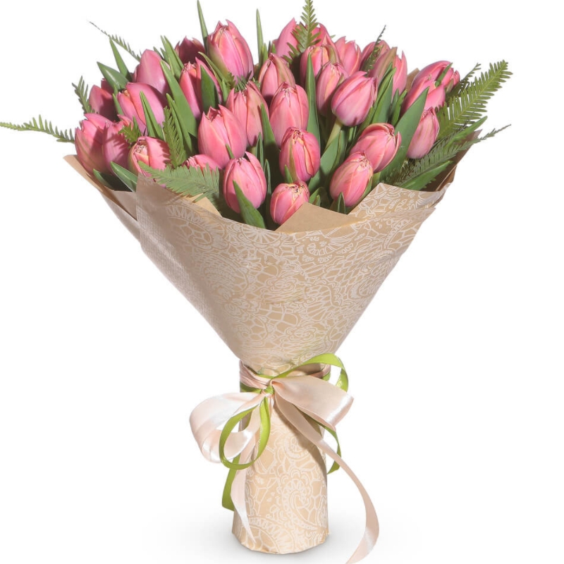 Букет состоит из 35 розовых тюльпанов, зелень, крафт, атласная лента.