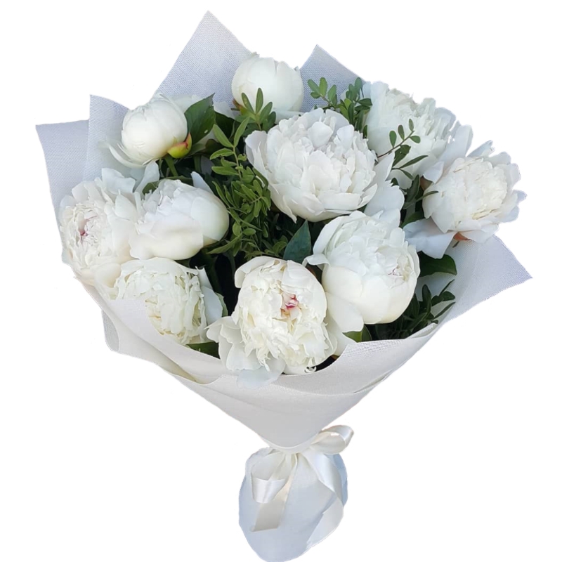 Букет состоит из 11 белых пионов, зелень, красивая упаковка, атласная лента.
