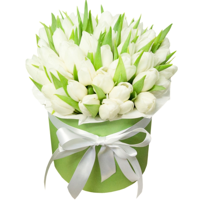 Букет состоит из 45 белых тюльпанов, коробка, атласная лента, оазис.
