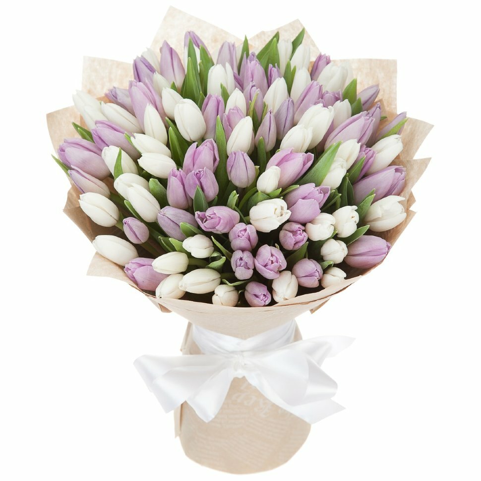 Букет состоит из 38 белых тюльпанов, 37 сиреневых тюльпанов, крафт, атласная лента.