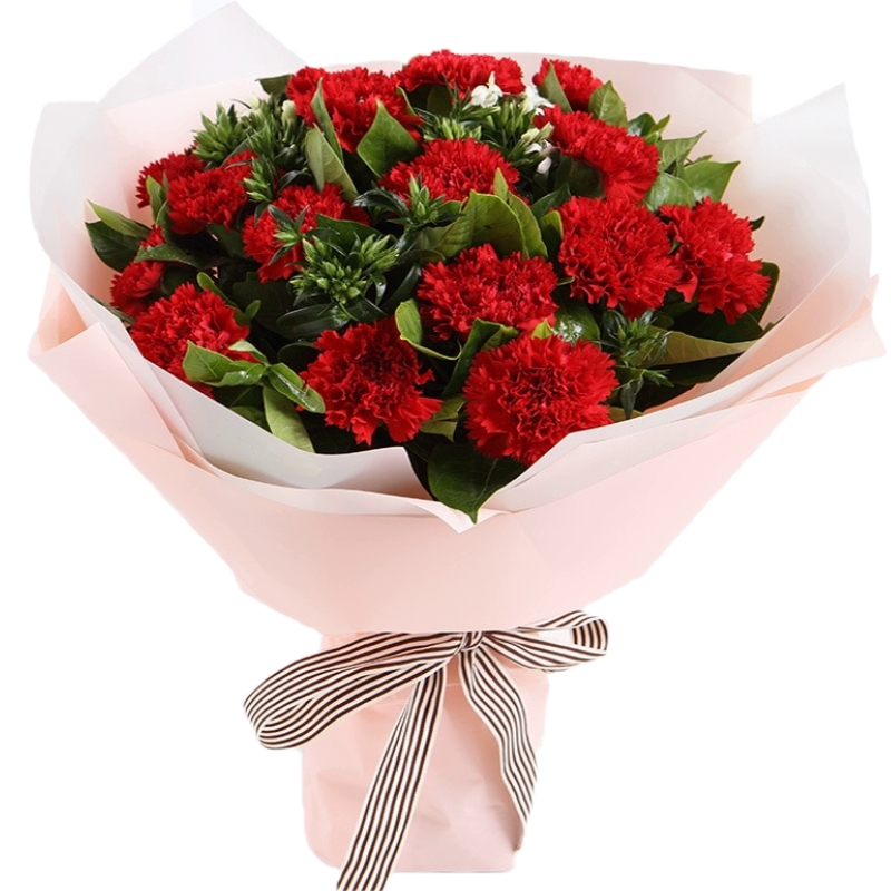 Букет состоит из 17 красных гвоздик, зелень, красивая упаковка, атласная лента.
