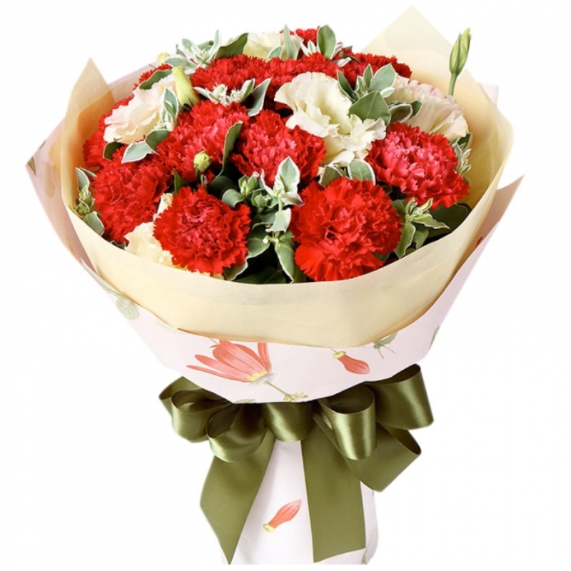 Букет состоит из 13 красных гвоздик, 5 белых эустом, зелень, красивая упаковка, атласная лента.
