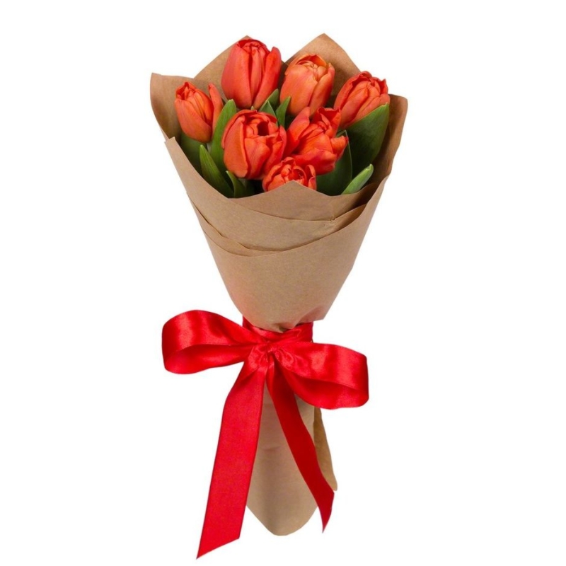 Букет состоит из 7 красных тюльпанов, крафт , атласная лента.
