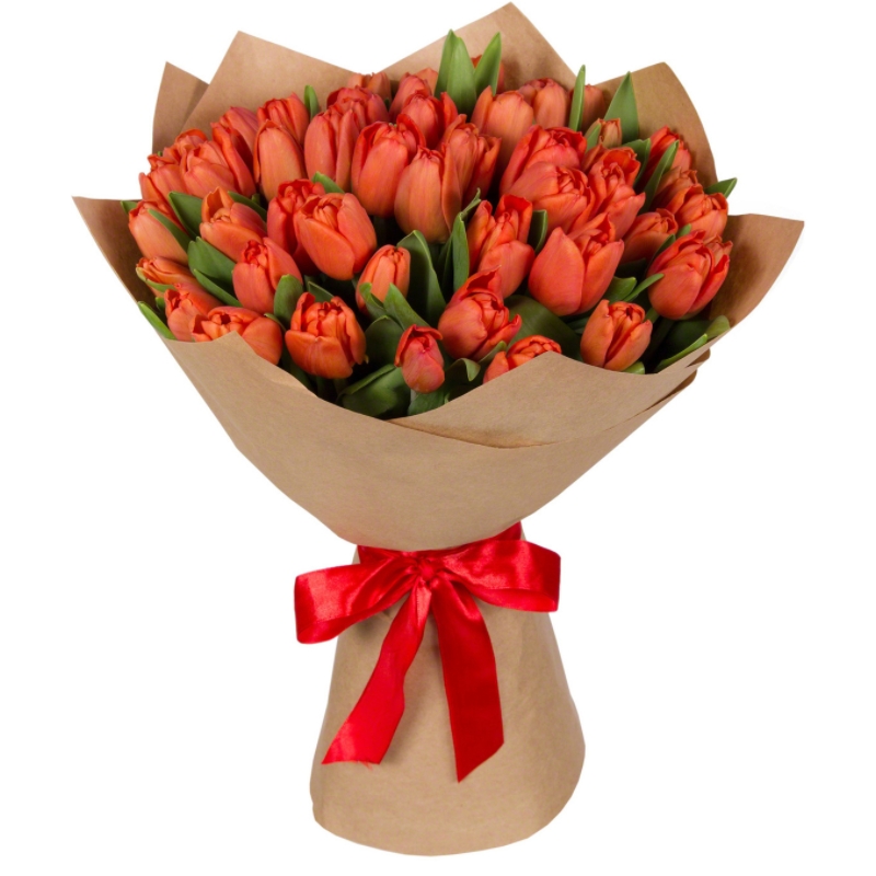 Букет состоит из 45 красных тюльпанов, крафт, атласная лента.