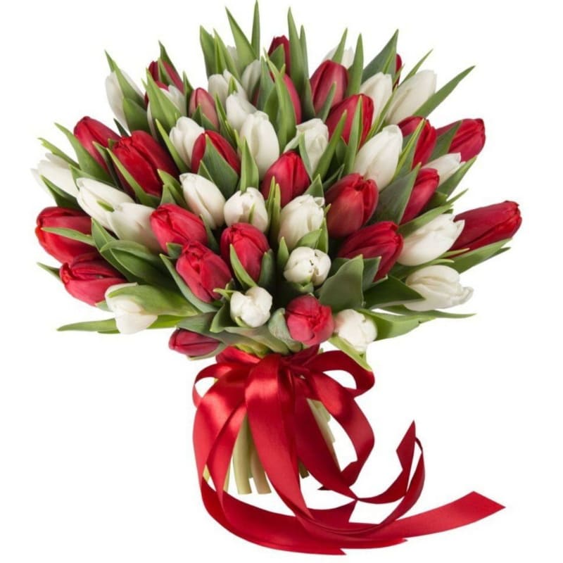 Букет состоит из 23 красных тюльпана, 22 белых тюльпана, прозрачная упаковка, атласная лента.