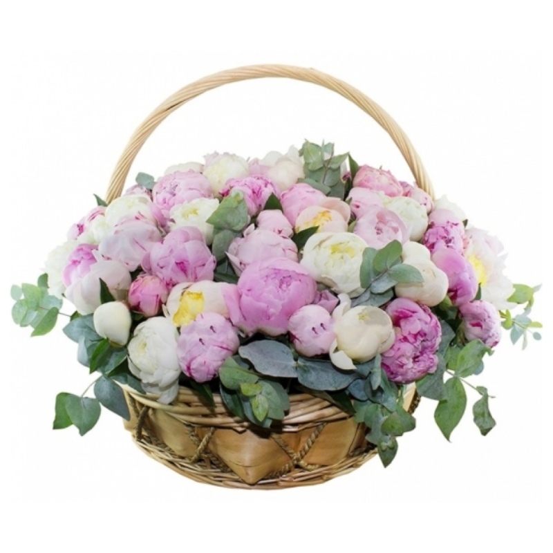 Букет состоит из 25 розовых пионов, 20 белых пионов, эвкалипт, корзина, оазис.