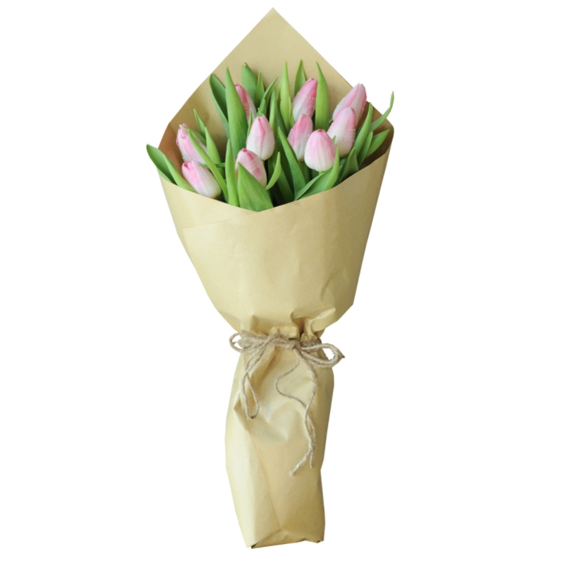 Букет состоит из 9 розовых тюльпанов, крафт.