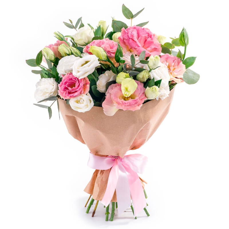 Букет состоит из 15 веток белой и розовой эустомы, зелень, крафт, атласная лента.