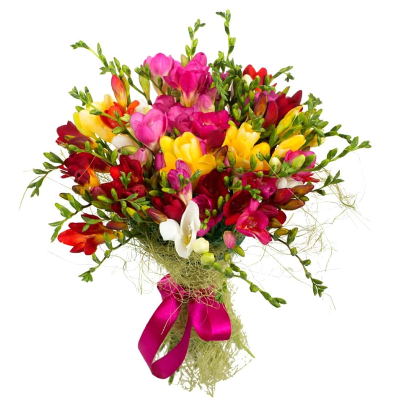 Букет состоит из MIX из 25 фрезий, красивая упаковка, атласная лента.