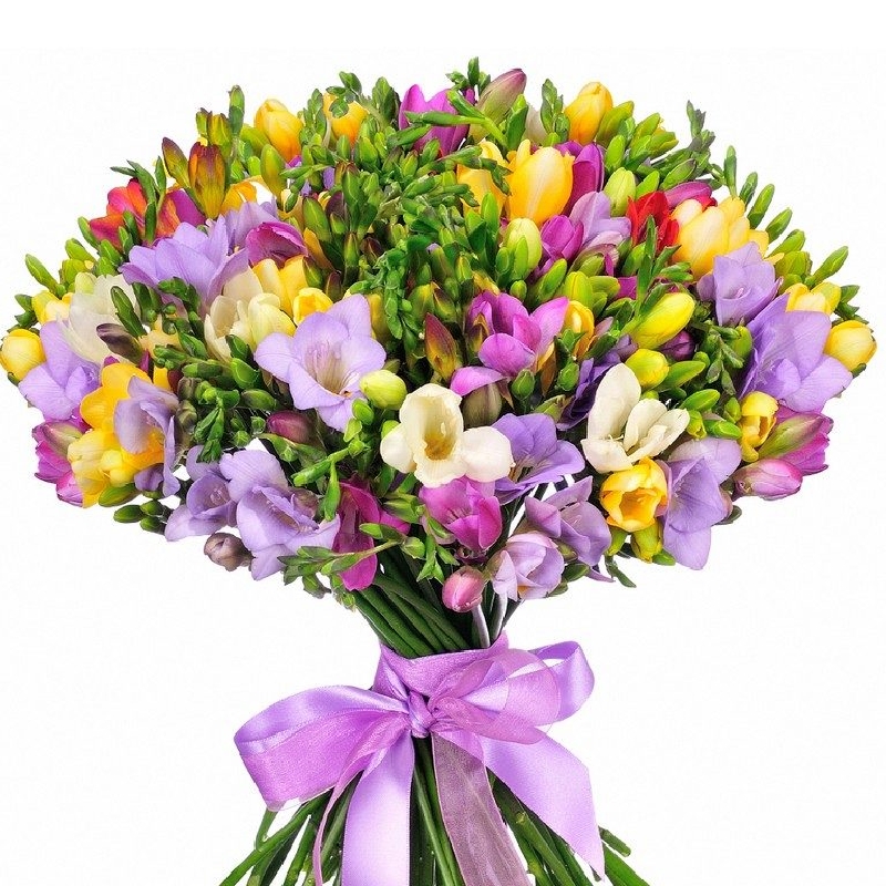 Букет состоит из Букет MIX из 51 фрезии, прозрачная упаковка, атласная лента.