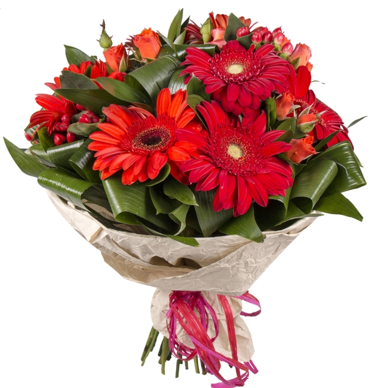 Гербера, Гиперикум, Роза кустовая |