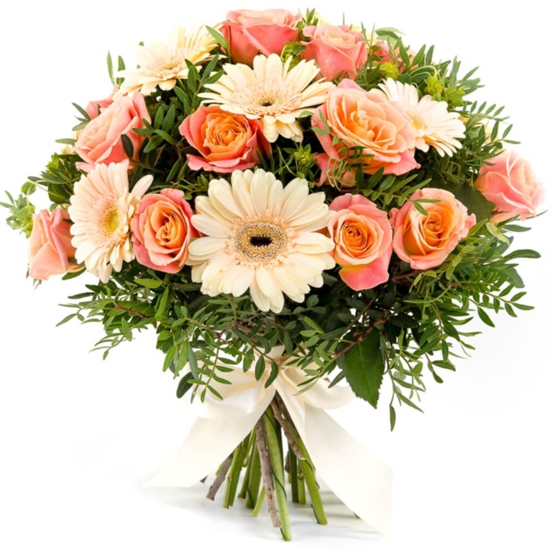 Букет состоит из 15 коралловых роз, 9 гербер, декоративная зелень, прозрачная упаковка, атласная лента.