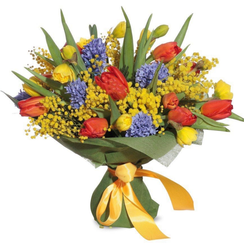 Букет состоит из 10 тюльпанов, 9 нарциссов, 5 гиацинтов, 5 веток мимозы, красивая упаковка, атласная лента.