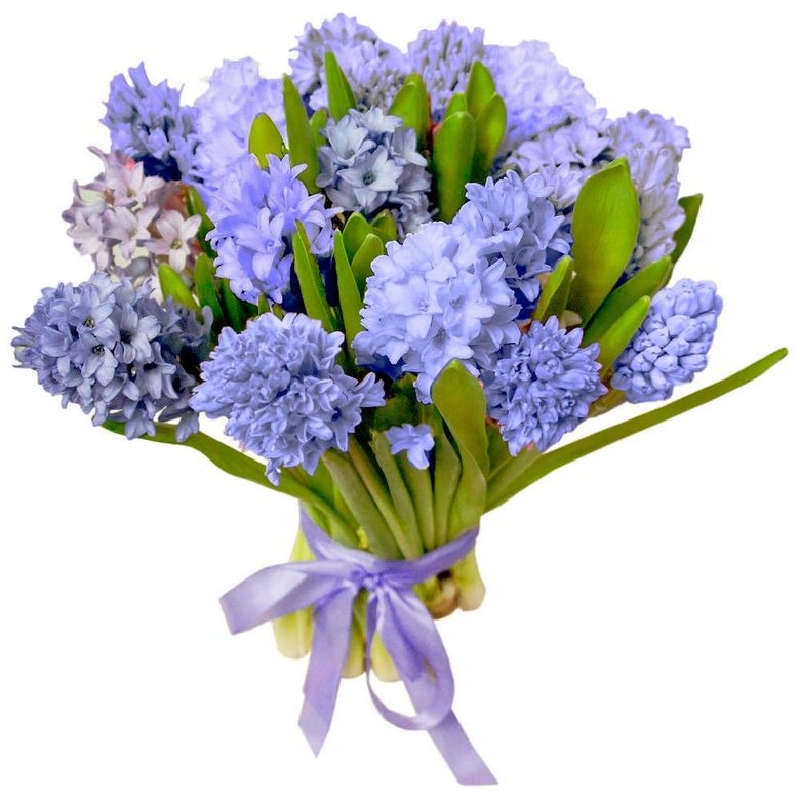 Букет состоит из 19 синих гиацинтов, прозрачная упаковка, атласная лента.