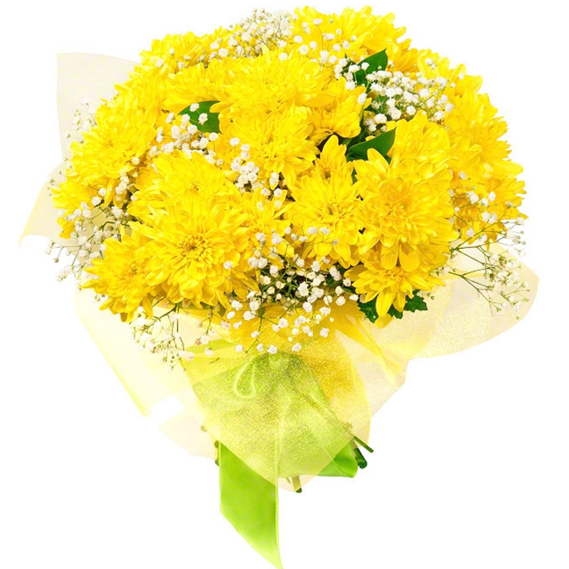 Букет состоит из 7 веток желтой хризантемы, 5 веток гипсофилы, зелень, сизаль, атласная лента.
