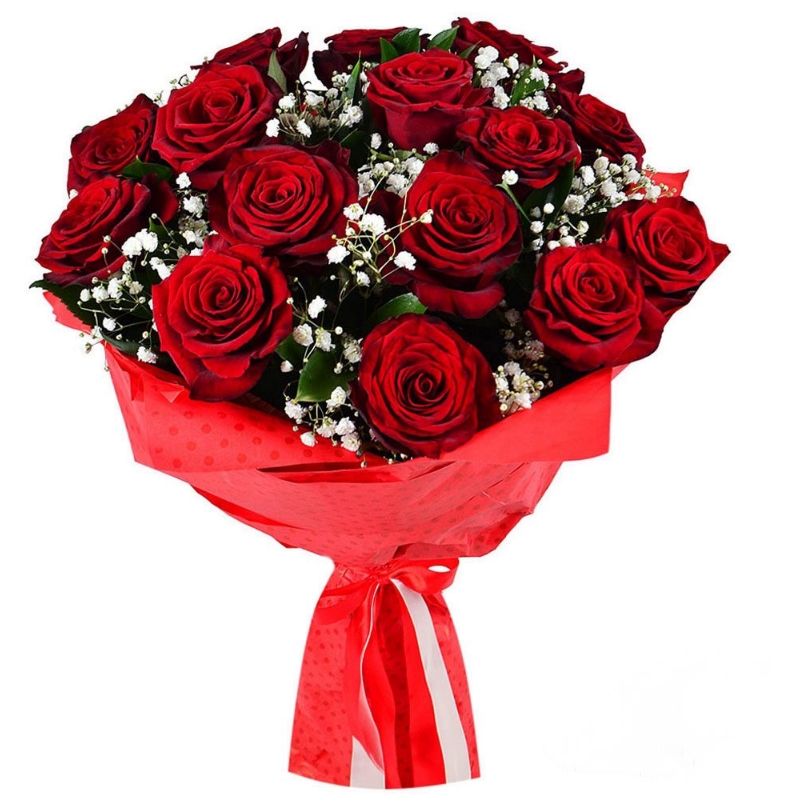 Букет состоит из 15 красных роз, 3 ветки гипсофилы, красивая упаковка, атласная лента.