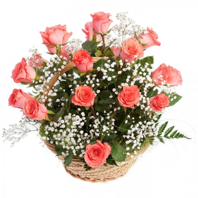 19 розовых роз, 5 гипсофила, зелень, корзина.