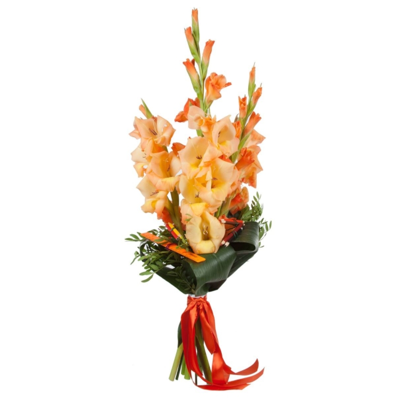 Букет состоит из 7 оранжевых гладиолусов, аспидистра, зелень, прозрачная упаковка, атласная лента.