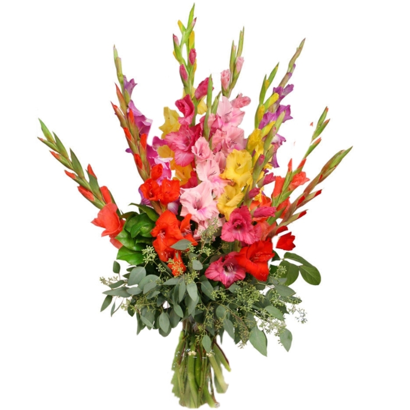 Букет состоит из MIX из 15 гладиолусов, зелень, прозрачная упаковка, атласная лента.