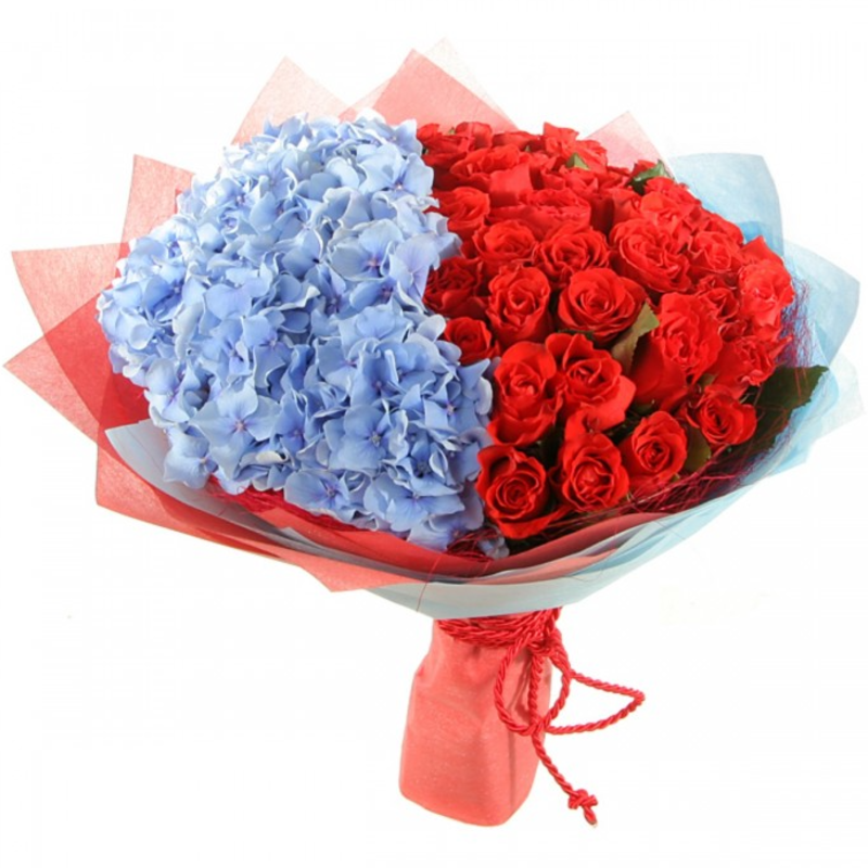 Букет состоит из 41 красная роза, 3 голубые гортензии, красивая упаковка, атласная лента.