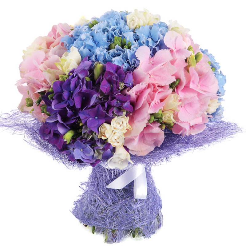 Букет состоит из 7 разноцветных гортензий, 4 ветки эустомы, красивая упаковка, атласная лента.