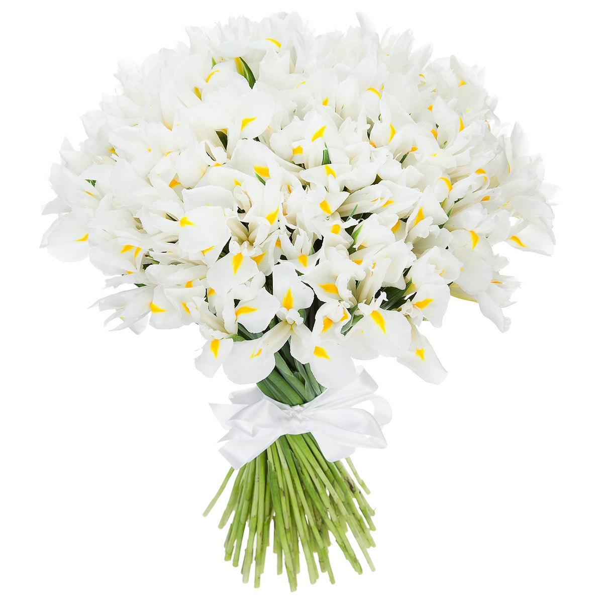 Букет состоит из 51 белый ирис, прозрачная упаковка, белая лента.