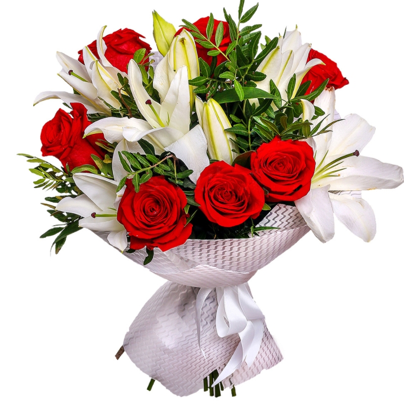 Букет состоит из 7 красных роз, 3 ветки белой лилии, красивая упаковка, атласная лента.