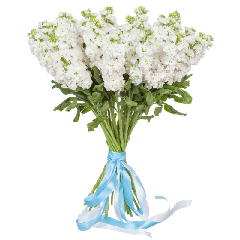 Букет состоит из 19 белых маттиол, прозрачная упаковка, атласная лента.