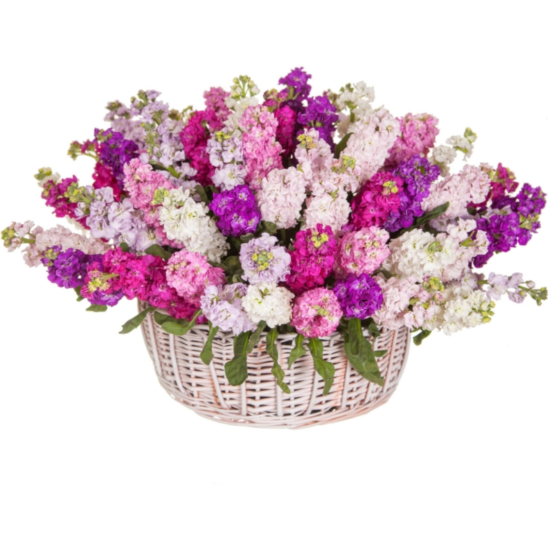 Букет состоит из MIX из 51 маттиолы, зелень, корзина, оазис.