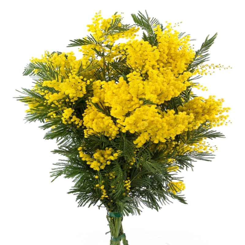 Букет состоит из 11 веток мимозы, прозрачная упаковка, атласная лента.