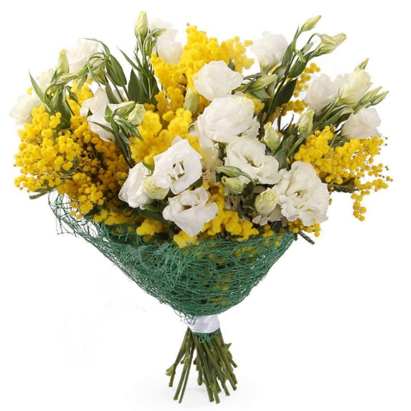 Букет состоит из 10 веток эустомы, 9 веток мимозы, красивая упаковка, атласная лента.