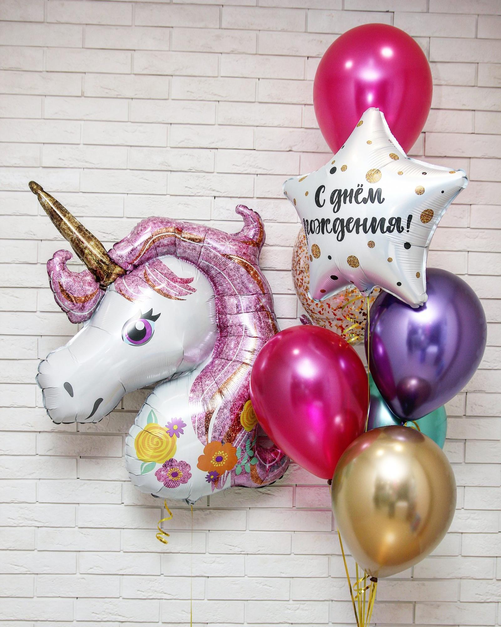 В состав фонтана входят 5 латексных шаров в разном цвете, 1 прозрачный шар с конфетти, 1 фольгированная звезда и Единорог.