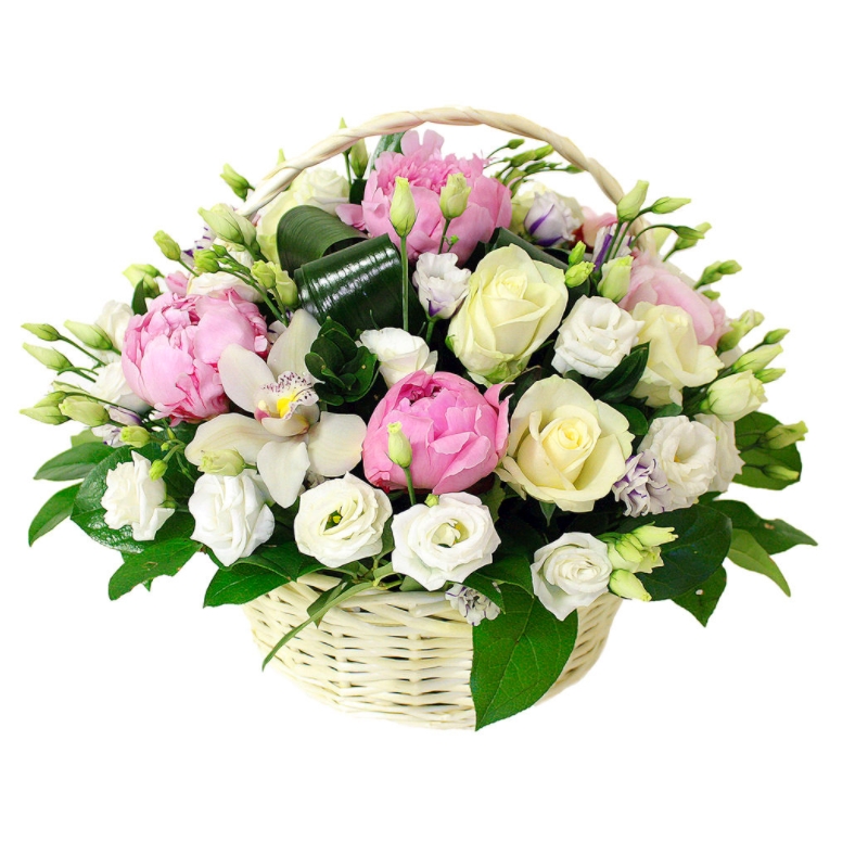 Букет состоит из 5 пионов, 7 роз, 2 орхидеи, 7 веток эустомы, зелень, корзина, оазис.