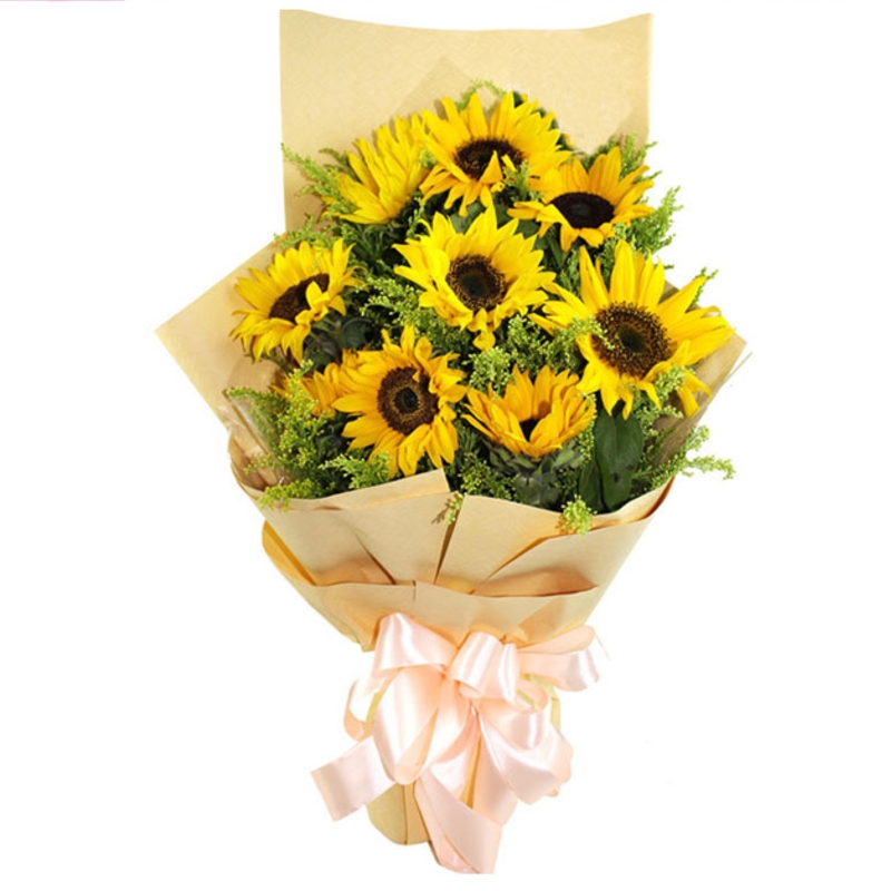 Букет состоит из 9 подсолнухов, 10 веток солидаго, зелень, крафт, атласная лента.
