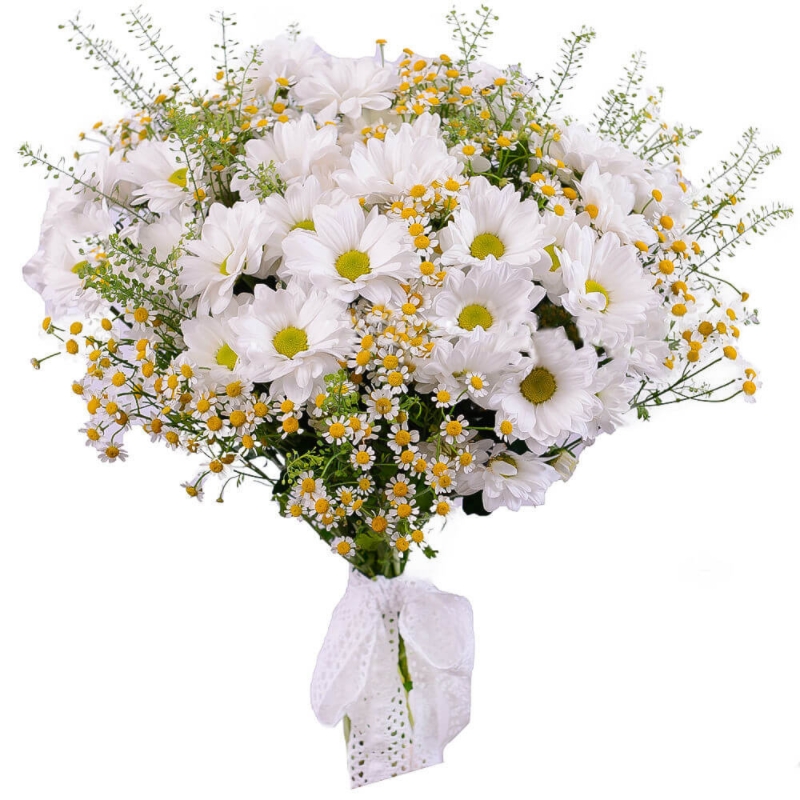 Букет состоит из 7 веток хризантемы, 12 веток танацетума, прозрачная упаковка, атласная лента.