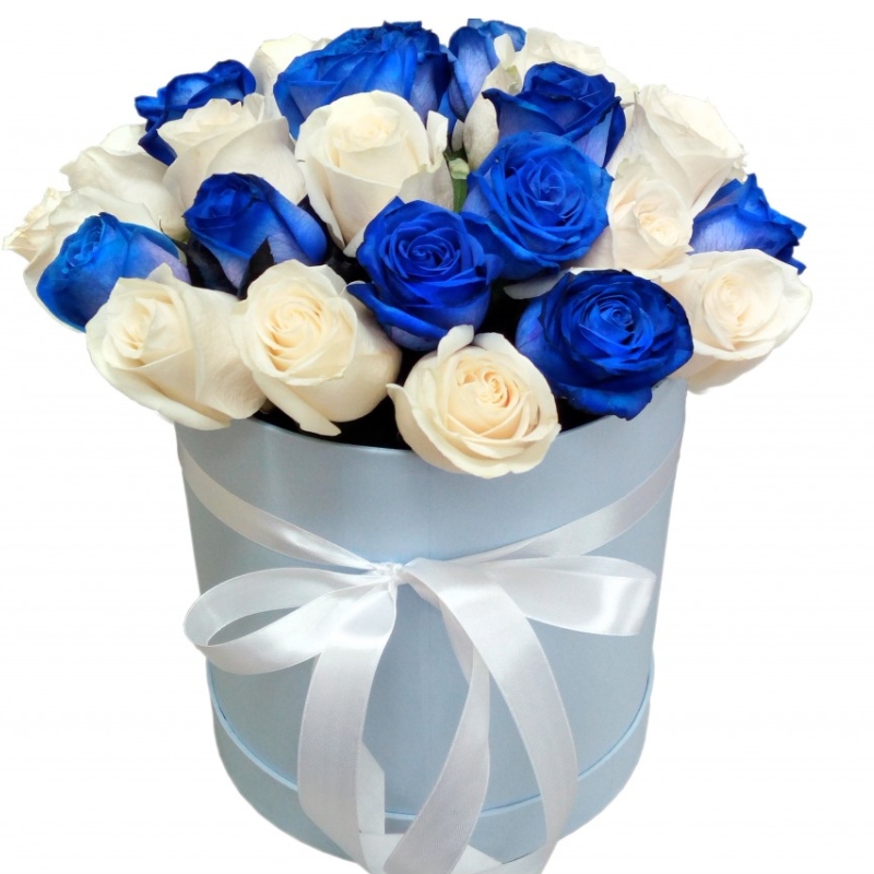 Букет состоит из 14 белых роз, 11 синих роз, коробка, оазис.