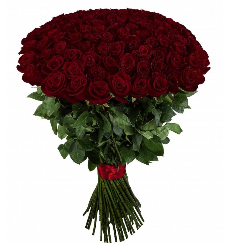 Букет состоит из 101 бордовая роза, прозрачная упаковка, атласная лента.