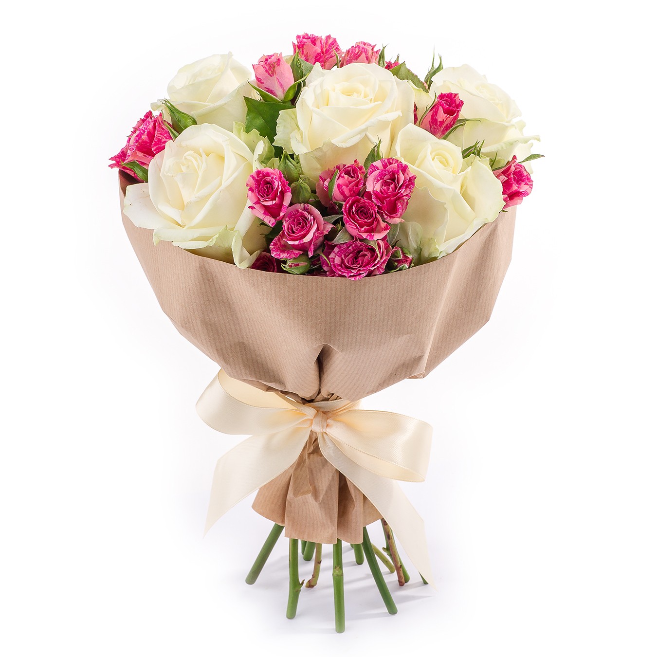 Букет состоит из 5 белых роз, 4 ветки красной кустовой розы, крафт, атласная лента.