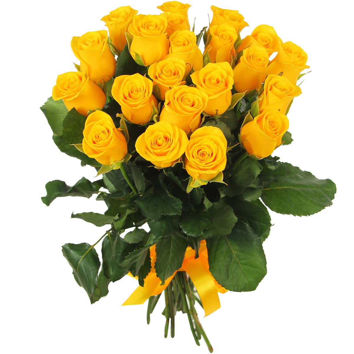 Букет состоит из 21 желтая роза, прозрачная упаковка, атласная лента.