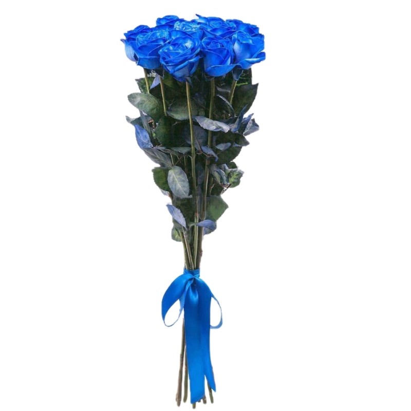Букет состоит из 11 синих роз, прозрачная упаковка, атласная лента.