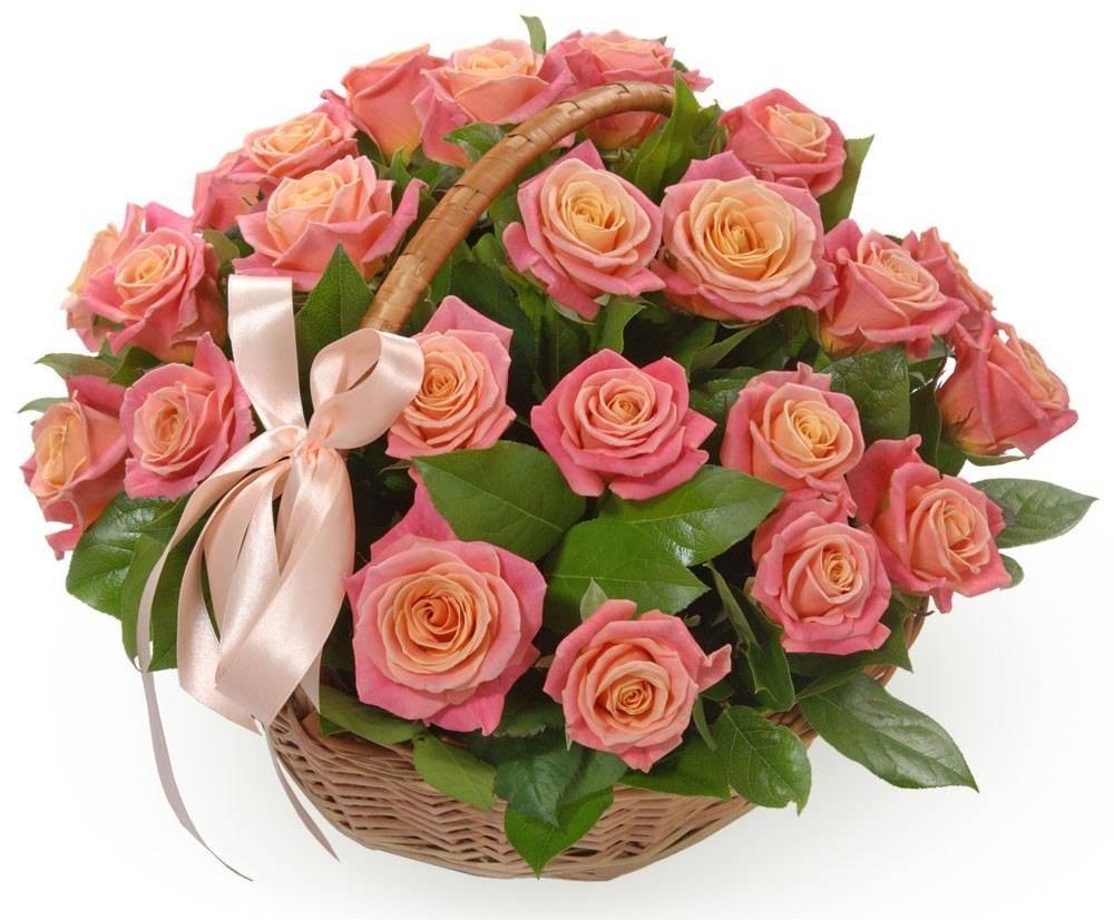 Букет состоит из 25 розовых роз, корзина, розовая лента.
