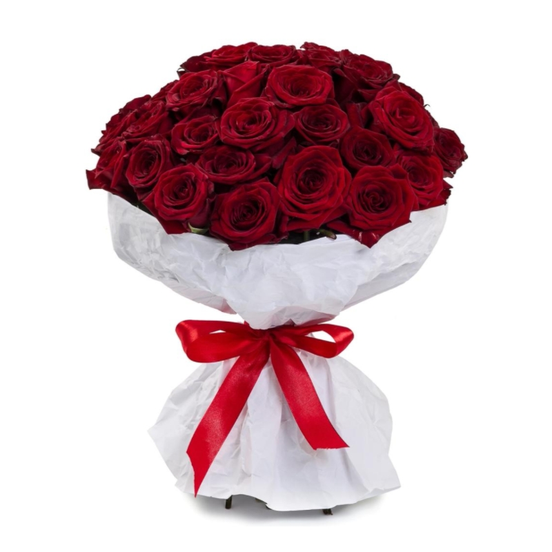 Букет состоит из 55 красных роз, белая упаковка, атласная лента.