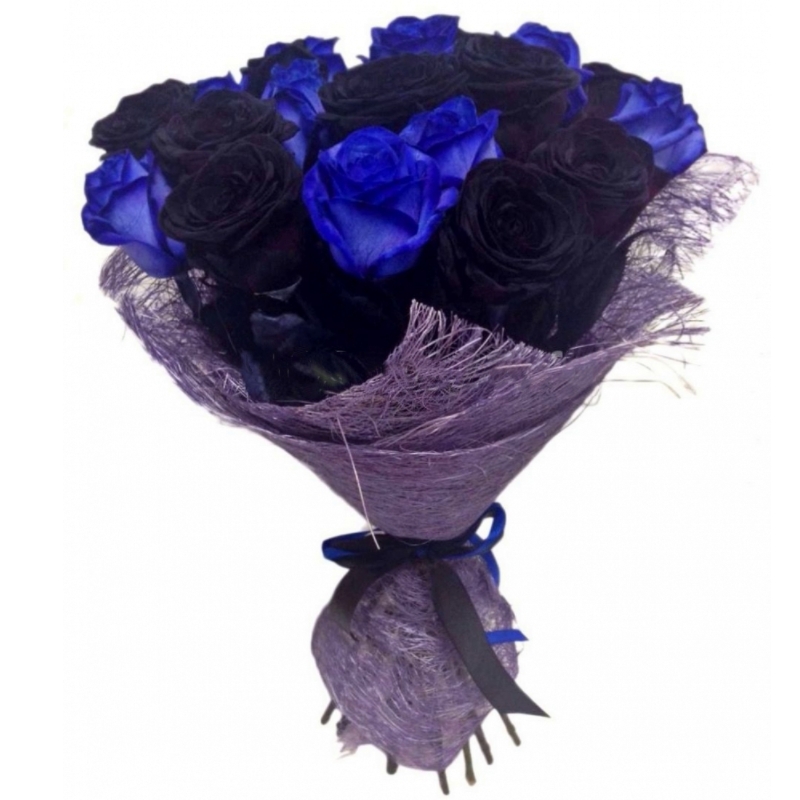 Букет состоит из 11 черных роз, 10 синих роз, сизаль, атласная лента.